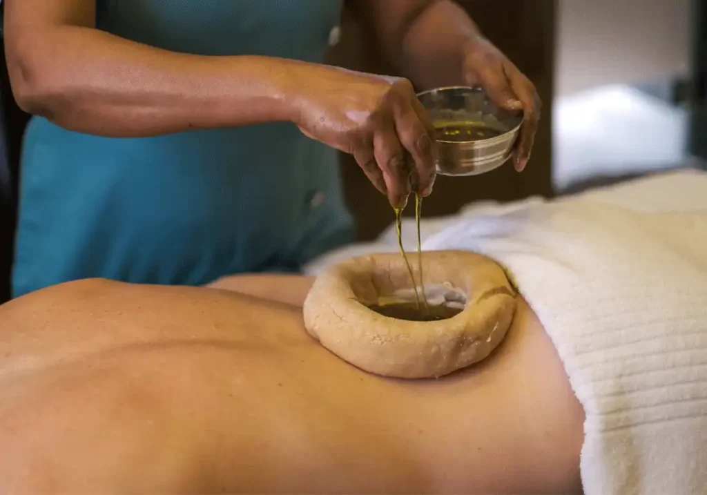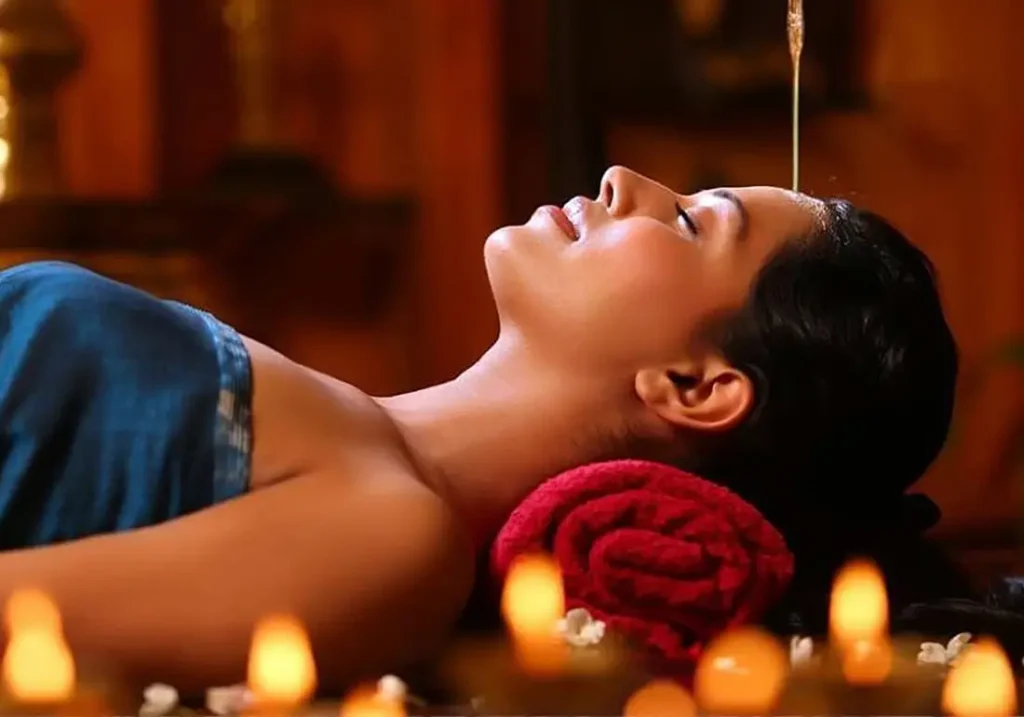 - A continuous stream of warm oil poured on the forehead (Shirodhara) to induce deep relaxation